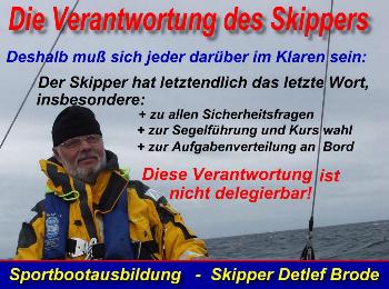 Viele Dinge während des Segeltörns werden wir gemeinsam besprechen und entscheiden, doch Skipperanweisungen die die Sicherheit, das Verhalten bei Schlechtwetter, bei nötigen Segelmanövern oder beim An- und Ablegen betreffen, sind nicht oder nur bedingt diskudierbar. Auch die letztendliche Reiseroute obliegt letztendlich der Entscheidung des Skippers. Hier spielen die Wetterlage, Reisezeiten, Brückenöffnungszeiten, Hafenbedingungen und vieles mehr eine Rolle. Auch für die Rückreisezeit muss eine Reserve vorhanden sein. Natürlich werden wir darüber sprechen und Sie werden meine Entscheidungen dann auch leicht verstehen. Also: Der Skipper hat die letztendlich bindende Weisungsbefugnis und diese wird er immer dann durchsetzen, wenn es um die Sicherheit des Schiffes und eines jeden einzelnes Besatzungsmitglied geht. Bedenken Sie, er kennt die Besonderheiten des Fahrtgebietes, muss die Mentalität der Besatzung berücksichtigen, das zu erwartende Wetter bewerten und muss viele andere Dinge bedenken, von deren Zusammenhängen die Crew mitunter nur ahnen kann. (Bitte beachten, dass ich keine Sportboot-Ausbildung mehr durchführe!)