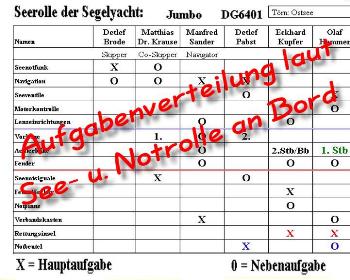 Ein Segeltörn wird zuerst natürlich als reines Freizeitvergnügen verstanden, doch ganz so einfach ist es nicht. Zuerst gibt es die Regeln des guten Seemannsbrauchs und zum anderen gibt es aber auch gesetzliche Vorschriften und der Skipper hat besondere Verantwortungspflichten und richtig gesehen ist es für ihn nie nur ein "Urlaubsvergnügen". Viele Freizeit-Skipper begreifen diese Verantwort nicht richtig und es kommt immer wieder zu folgenschweren Unfällen. Damit jeder Segeltörn ein ungetrübtes Urlaubsvergnügen bleibt, ergeben sich für den Skipper: 1. Pflichten, die Crew an Bord einzuweisen, konkrete Aufgaben zu verteilen und für den Unfallschutz zu sorgen. 2. Er hat letztendlich für alles die Verantwortung an Bord und diese Verantwortung ist nicht deligierbar - was heißt, egal wer was tut, die getzliche Verantwortung für die Folgen bleiben beim Skipper. Siehe dazu auch bei Skipperverantwortung und Reiseplanung. Diese Aufgabenverteilung an Bord erfolgt gemäß den Fähigkeiten der einzelnen Crewmitglieder. Damit jeder weiß, welche Aufgaben an Bord jeder hat, gibt es die See- und Notrolle. Es sind also zwei Rollen: die eine für den normalen regulären Bordbetrieb und dann eine Aufgabenverteilung für den Notfall an Bord. Die See- und Notrolle wird vorher gemeinsam erstellt und besprochen und an Bord erhält jeder eine persönliche konkrete Einweisung dazu. Aber keine Angst davor, da wird keiner überfordert. Sie werden sehen, schnell sind wir eine einespielte Gemeinschaft an Bord und können den Törn mit gutem Gefühl genießen. | ||||||||||||||||||||||||||||||||||||||||||||||||||||||||||||||||||||||||||||||||||||||||||||||||||||||