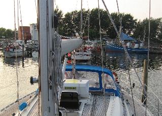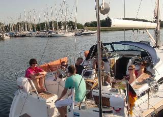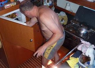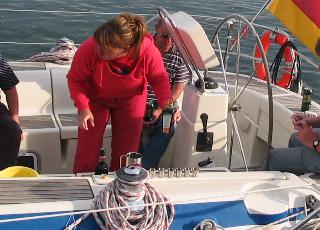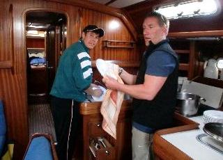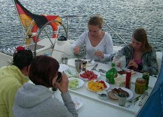 An Bord befindet sich ein Propangasherd mit Backofen. Ich erwähnte es schon, zum Frühstück lassen sich da leckere Brötchen backen. Der Gasherd ist gardanisch gelagert (d.h. schwenkbar), so daß er auch bei schräg liegender Yacht benutzt werden kann. Zudem lassen sich die Töpfe fixieren. Ausreichend Geschirr ist an Bord vorhanden, lediglich reichlich Geschirrtücher sollten mitgenommen werden. An Bord befindet sich mindest eine elektrische geräumige Kühlbox bzw. in neueren/größeren Yachten richtige Kühlschränke mit Tiefkühlfächern. Problem aller ist aber die Energieversorgung. Im Hafen mit 220V Landanschluß und auf See mit laufender Maschine wird schon ordentlich gekühlt - aber bei stundenlangem Segeln eben nicht. Da muß man sehen, dass die Dinger kalt bleiben. | |||||||||||||||||||||||||||||||||||||||||||||||||||||||||||||||||||||||||||||||||||||||||||||||||||||