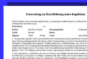 Sie werden dann vor bzw. zeitnah zur Buchung der Yacht den Crewvertrag zur Unterschrift bekommen. Sofern Sie zu einer Crew hinzukommen, die noch nicht ganz vollständig ist, werden Sie dann unverzüglich der Crewvertrag unterzeichnen. Dies ist wichtig, damit der Skipper Planungssicherheit bekommt. Der Crewvertrag wird mit jedem Crewmitglied und dem Skipper einzeln abgeschlossen. Dieser Vertrag regelt so ziemlich alles zu Ihrer persönlichen Teilnahme am Törn. Angefangen von den Terminen, über Verhaltensweisen an Bord, persönlichen Dokumenten bis hin zu den Zahlungsbedingungen ist darin alles enthalten. | |||||||||||||||||||||||||||||||||||||||||||||||||||||||||||||||||||||||||||||||||||||||||||||||||||||