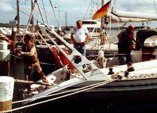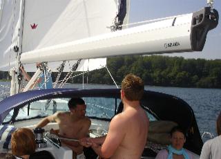 Segelmanöver Die vielen Leinen an Bord werden Sie schnell beherrschen lernen. Die meisten Arbeiten dazu werden wir von der Plicht aus erledigen. Dies ist der Aufenthaltsbereich hinten auf der Yacht. Sie stehen also immer unter der Aufsicht und Anleitung des Skippers. Über die speziellen Unfallgefahren hierzu und zu besonderen Verhaltens- und Arbeitsweisen werde ich Sie an Bord hinreichend unterrichten. Nach der Grundeinstellung der Segel wird die Yacht Fahrt aufnehmen und der Skipper bringt sie auf Kurs. Dann habe ich eine interessante Aufgabe für die Crew - den Segeltrimm. An Hand von Tafeln und Hinweisen zeige ich Ihnen, wie man es richtig macht und Sie dürfen dann daran arbeiten und beobachten, wie die Yacht immer schneller (oder ggf. auch langsamer) wird. Schnell wird Sie das gemeinsame Fieber packen, immer schneller zu segeln, als die anderen - aber die machen natürlich so was auch ... Ich werde stets dafür Sorgen, dass keine Lange Weile an Bord aufkommt. Soweit Sie es können und in der Lage sind, sind Sie einbezogen in die Steuerung der Yacht. Sie werden viel interessantes lernen und unvergeßliche Eindrücke mit nach Hause nehmen. | ||||||||||||||||||||||||||||||||||||||||||||||||||||||||||||||||||||||||||||||||||||||||||||||||||||||