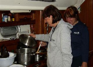 An Bord befindet sich ein Propangasherd mit Backofen. Ich erwähnte es schon, zum Frühstück lassen sich da leckere Brötchen backen. Der Gasherd ist gardanisch gelagert (d.h. schwenkbar), so daß er auch bei schräg liegender Yacht benutzt werden kann. Zudem lassen sich die Töpfe fixieren. Ausreichend Geschirr ist an Bord vorhanden, lediglich reichlich Geschirrtücher sollten mitgenommen werden. An Bord befindet sich mindest eine elektrische geräumige Kühlbox bzw. in neueren/größeren Yachten richtige Kühlschränke mit Tiefkühlfächern. Problem aller ist aber die Energieversorgung. Im Hafen mit 220V Landanschluß und auf See mit laufender Maschine wird schon ordentlich gekühlt - aber bei stundenlangem Segeln eben nicht. Da muß man sehen, dass die Dinger kalt bleiben. | |||||||||||||||||||||||||||||||||||||||||||||||||||||||||||||||||||||||||||||||||||||||||||||||||||||