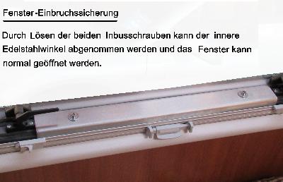 gesicherte zusätzliche Lüftung haben möchte. Zusätzlicher mechanischer Schutz an Fenstern + Die Fenster im Womo sind immer ein Schwachpunkt, was das Aufbrechen betrifft. Da gibt es im Internet diverse Bügel, die das Aufbrechen verhindern oder bzw. erschweren sollen. War mir zu teuer und zu primitiv und ich habe nach einer stabileren Lösung gesucht. Wie in den nachfolgenden Bildern zu sehen habe ich breite und stabile Edelstahlprofile verwendet, die sich auch bei großer Hebelwirkung nicht verbiegen. Das eine der Profile ist mit einer zusätzlichen Edelstahlleiste am Fenster vernietet und verklebt. Das Innere Blech ist mittels Inbusschraube befestigt, um die Fenster auch mal öffnen zu können. Und Täter werden ja wohl kau einen passenden Inbus-Schlüssel dabei haben und vorher müssten ja auch erst mal zwei so große Löcher in die Doppelte-Scheibe geschlagen werden. Und hierbei ist Plaste zäher als Glas. |