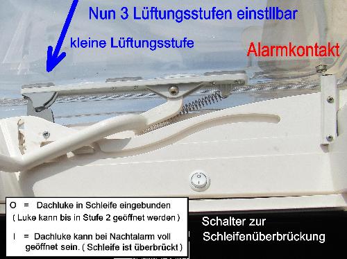 Dachluken Die Dachluken sind wie bereits erwähnt in die Sicherheitsschleife der Alarmanlage integriert. Hierbei sind die Schaltkontakte aber so angebracht, dass ein Öffnen der Dachluken bis zur zweiten (mittleren) Stufe noch möglich ist. + Beide Dachluken sind in den beiden unteren Öffnungsstufen zusätzlich mit Haken gesichert, so dass man die Dachluken von außen nicht hochheben kann bzw. man kaum an den Haken herankommt. Bei stürmischem Wetter bietet dies zusätzlich Sicherheit, so dass die Luken nicht durch starken Wind hochgerissen werden können. + Ursprünglich gab es nur 2 Lüftungsstufen. Dann habe ich eine noch kleinere Lüftungsstufe gebaut, weil dies für Nachts oder widrigem Wetter oft notwendig ist. Auch diese kleine Lüftungsstufe ist mit einem Metallbügel gesichert, der nur von innen zugänglich ist. + Zusätzlich habe ich noch einen "Schleifenschalter" eingebaut, wo man auch im voll geöffneten Zustand der Luke (Stufe 3) manuell die Schleife schließen kann. Das ist besonders nachts nützlich wenn die Alarmanlage auf Nachtbetrieb läuft und man bei großer Hitze auch nachts die volle Lüftung braucht. |
