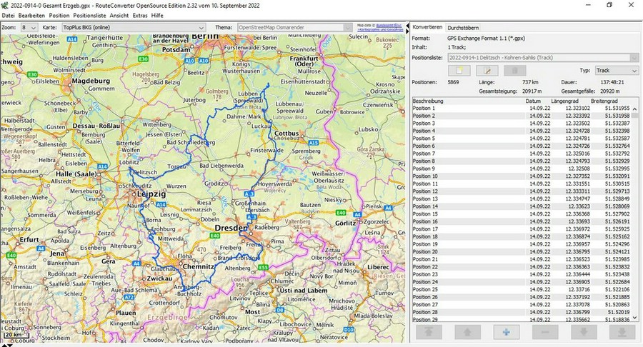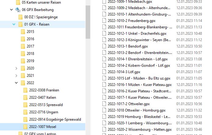 dem Womo heraus und hat immer eine Track-Aufzeichnung. Dazu muss man sich die App Mapy.cz aufs Handy laden. Dann sollte man noch zu Hause im W-Lan all die Länderkarten herunterladen, die man braucht für unterwegs. Dann muss man unterwegs nicht stets online zu sein. Da kommen einige Gigabit zusammen und man sollte da im Handy schon eine SD-Card von entsprechender Größe haben Mapy.cz hat meiner Sicht nach 2 entscheidende Vorteile: 1. Es läuft im Hintergrund stabil weiter. Selbst wenn das Handy neu startet, macht das Programm da weiter, wo es unterbrochen wurde. 2. Für die aufgezeichneten Tracks gibt es eine Exportfunktion im GPX-Format. Einige Vorabbemerkung hierzu: a) man sollte jede beendete Route oder Wanderung separat abspeichern. Das erleichtert später die Archevierung. b) man sollte dem beendeten Track bei der Speicherung einen eindeutigen Namen geben, obwohl Mapy.cz es von sich macht. Die spätere Einsortierung in chronologischer Reihenfolge wird enorm erleichtert, wenn man es so macht - z.B. 2022-1008 -name- Diese Datumsschreibweise (rückwärts) wird so auch in den Suchfunktionen bzw. Sortierungen in Ordnern verwendet. Habe ich an Tagen mehrere Track--Aufzeichnungen wache ich es einfach so: 2022-1008-1 usw. Ein Name wird schon von Mapy vorgeschlagen, den man übernehmen oder leicht abändern kann. Die Exportdatei kommt immer in den Download-Ordner des Handys. Von dort kann man es dann in den PC übertragen. Hierbei sollte man immer "Ausschneiden/Einfügen" verwenden, damit der Download-Ordner nicht zu unübersichtlich voll wird. Leider hat die Export-Datei erstmal nicht den Namen, denn wir für den Track vergeben hatten. Dies ist aber nicht schlimm, weil dann später im Programm "RouteConverterWindowsOpenSource" der Dateiname wieder da ist. c) Auf dem PC sollte man von Anfang an Ordnung schaffen und eindeutig benannte Ordner im Ordnerbaum anlegen, wenn man später mal etwas richtig wiederfinden will. Dazu später mehr. |