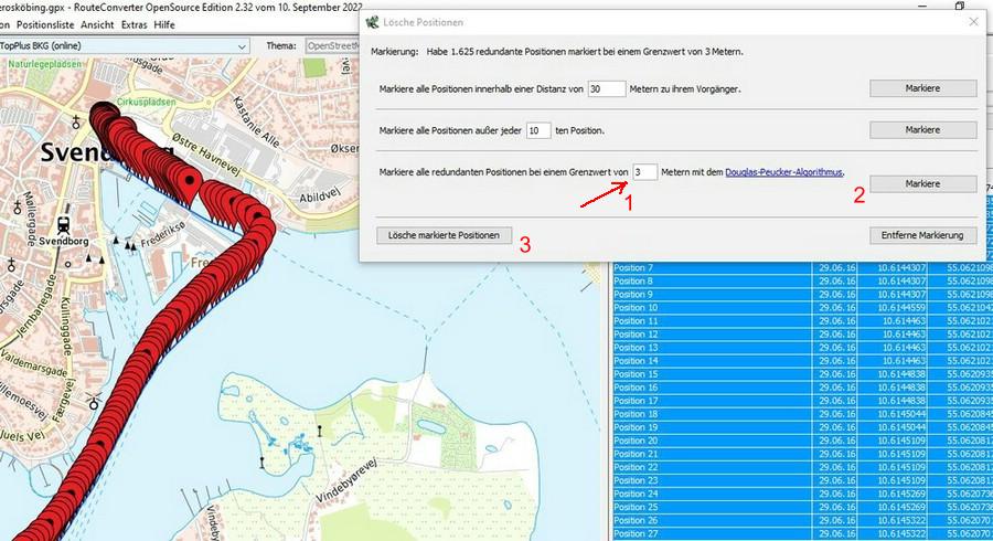 Ich möchte nun nicht das ganze Programm beschreiben, aber dennoch mal auf eine nützliche Funktion hinweisen, die man nicht gleich findet oder versteht: Eine erstmals geladene GPX-Datei beinhaltet unzählig viele GPS-Punkte, die das ganze unübersichtlich machen, eine unnötig große Datei erfordern und die Trackbearbeitung wesentlich erschweren. Mann braucht nicht all diese Punkte. Im Menüpunkt Position findet man ein nützliches Werkzeug - ganz unten "Doppelte Positionen löschen" Von den drei Optionen nimmt man die Unterste. Nach verschiedenen Versuchen habe ich 3 Meter als optimal erachtet. Dann "Markieren" drücken und "Lösche markierte Positionen". Fertig. |