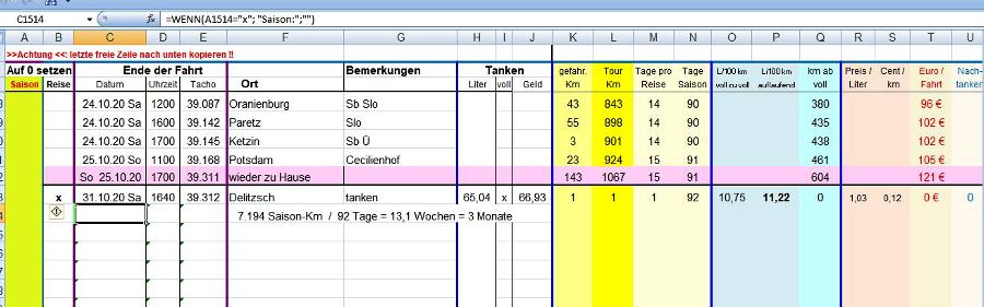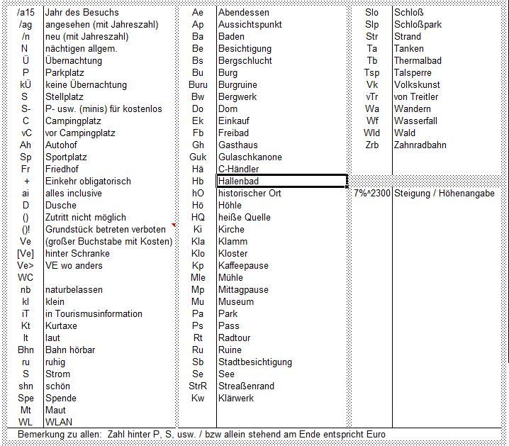 befindet sich vorn an der Frontscheibe. + Ein kleines Mauspad mit Bluetooth-Maus ist an der Tür-Armlehne angebracht. Mit dem Scrollrad der Maus kann ich bei Fahrt in der Karte zoomen oder auch mal schnell eine Straße sperren, um eine günstige Umleitung zu fahren. Der Blick dabei bleibt immer auf der Straße. Falsches oder gewolltes Abbiegen wird sofort mit einer Neuberechnung der Route quittiert. Welche Programme benutze ich für meine Navigation a) mfNavigator free Den bekommt man im Internet (bitte googeln, ich will hier keine Links nach außen) Für die Installation braucht man unbedingt W-Lan, weil die Länder-mca doch sehr speicherintensiv sind. Dafür braucht man dann bei der Navigation kein Internet. Nach der Installation wird man aufgefordert, Karten zu Installieren. Aber auch hier unbedingt auf die freien Karten weiterklicken. Dann geht so ziemlich alles automatisch, dauert nur seine Zeit insbesondere wenn man mehrere Länder installieren möchte. Der Navigator bietet aber mehr als nur Navigation + Einstellbare Fahrzeug und Straßenprofile. Da gibt es vorgegebene - ich kann aber x-beliebige eigene erstellen. Interessant sind die Straßenprofile (denn diese beeinflussen enorm das Navigationsgeschehen) So habe ich z.B. eingerichtet: Mit Autobahn, ohne Autobahn, mit Gemeindestraßen, ohne Gemeindestraßen. ohne Fähre, ohne Maut, schnellste oder kürzeste Strecke usw. So kann ich bei Start der Reise mit einem Klick vorgeben, wo lang es gehen soll oder ich kann dies mit einem Klick auch bei der Reise ändern. + Installierte zahlreiche POI-Typen ( z.B.: Geschäfte, Gaststätten, Postämter, Autohändler, Werkstätten, medizinische Einrichtungen u. Zahnärzte, Tierärzte, Banken, Hotels, Tourist-Informationen, Kultureinrichtungen, exponierte Sehenswürdigkeiten, Bus u. Bahn, Campingplätze, Caravan-Stellplätze, Fähren, Flugplätze, Gebührenstellen, Parkplätze, Parkhäuser, Reisebüros, Taxistände, Freizeitcentren, Schwimmbäder, Strandbäder, Sporteinrichtungen, Yachthäfen, Bergpässe, Gipfel, Aussichtspunkte, Kirchen, Friedhöfe, Polizei, Feuerwehr, Schulen, Universitäten, Betriebe) Hier muss man etwas probieren, bis man die für sich selbst optimalen Einstellungen hat. + Man kann eigene POI mit Text und Piktogramm einfügen - so unterschiedlich und viel man will. Allerdings geht dies nur über einen Umweg (den ich dann ausführlich beschreiben werde) + punktgenaue Entnahme von Koordinaten, um sie anderweitig verwenden zu können + exportierbare Track-Aufzeichnung der eigenen Routen (Dafür benutze ich aber das Handy mit "mapy.cz" - siehe weiter unten) + viele weitere nützliche Funktionen für die Routenplanung b) Microsoft-Excel (es geht aber auch jedes andere Tabellen-Kalkulationsprogramm) Ich benutze eine Excel-Datei. In dieser Datei habe ich untergebracht: 2. Mein Fahrtenbuch Mein Fahrtenbuch, natürlich mit vielen Berechnungs- und Anzeigemöglichkeiten, hier nur mal ein Bild ohne es weiter zu erklären |