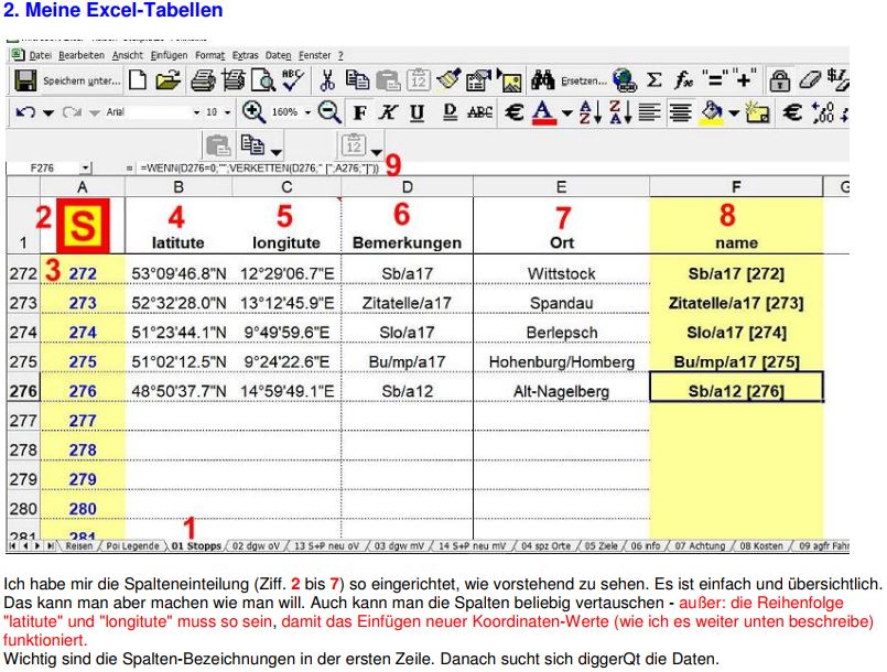 und aktuell. 3. Poi - Datenbank und Wechselwirkung zum Mf-Navigator + für jede POI-Art und dem dazugehörigem Piktogramm eine Tabelle: Diese Tabellen haben schon das Format, wie ich sie brauche, um die Daten in eine *.mca Datei zu konvertieren. die dann in den Navigator exportiert werden muss. Nachfolgend würde so ein Tabellenblatt aussehen. Für jedes Piktogramm muss ein eigenes Tabellenblatt erstellt werden. Dann müssen diese Datensätze natürlich gepflegt und ergänzt werden. Mache ich gleich täglich. Das geht schnell und man vergisst nichts. + Brauche ich eine neue Tabelle für ein neues POI, dann wird ein nicht so volles Tabellenblatt duplizieren und dem Tabellenblatt einen Namen geben, die Daten in den weißen Feldern löschen und neue Eintragungen beginnen. Links oben dann noch das Bild des neuen Pic einfügen. (im diggerQt muss diese neue Tabelle dann natürlich auch noch eingefügt/angemeldet werden) |